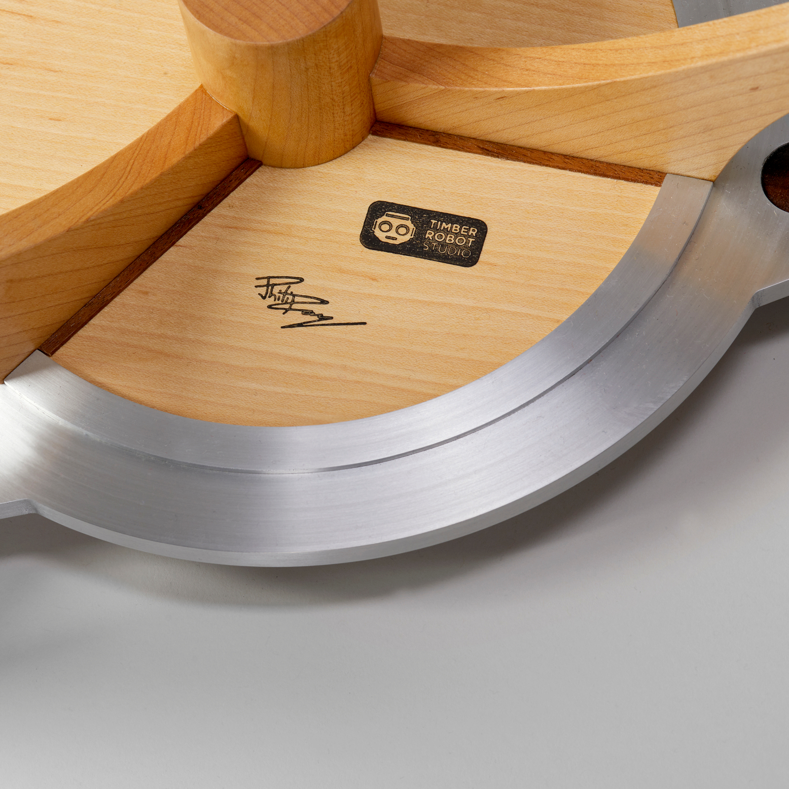 Inspired by Philip’s work in the uk film industry. A discarded object from a film prop, was the seed of this design. Embracing an industrial / engineered aesthetic, balancing cold metal and warm timber with machine like forms. Sharp lines and bold shapes give this piece some impact.