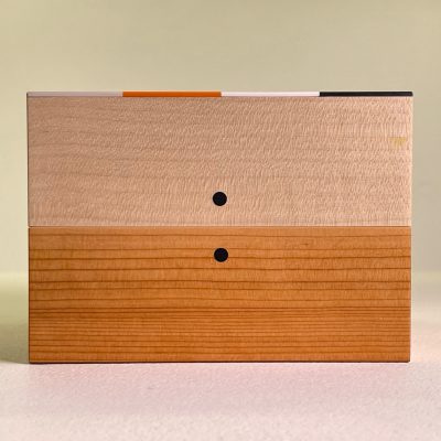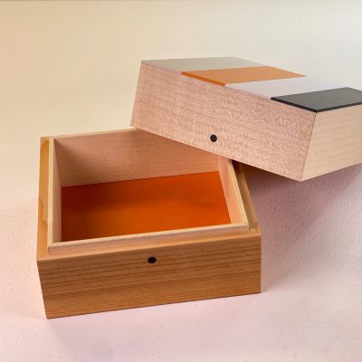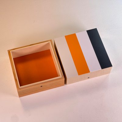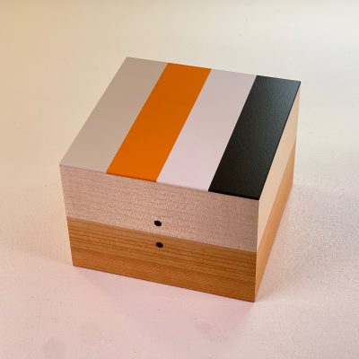Divided horizontally into two equal parts, the top half of this box is Sycamore and the bottom half is English Yew. Four equal strips of ‘ColorCore’ (solid core laminate by ‘Formica’) are bonded to the top of the box in a simple, bold arrangement. The inside walls of the bottom half are lined with Sycamore and the base and top are lined with bright orange suede.