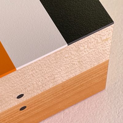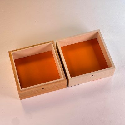 I’ve always been into squares, and I like the simplicity of two equal parts. In essence, that’s what this box is all about. ColorCore is thicker than the plastic laminates most of us are familiar with and the colour is solid throughout its thickness so one can celebrate the edge of the material as a design feature. Orange holds this design together being featured as part of the bold laminate top, inferred by the use of Yew and played out in suede on the interior.