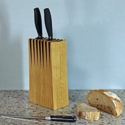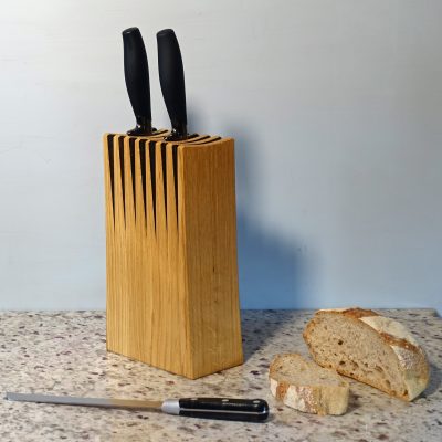 Most of what I have said about the making of my slash-free Elm knife blocks also applies to this one in Oak. That is because, in order to make this design, I took one of those as the starting point and chopped it into several pieces with an axe along each knife slot.