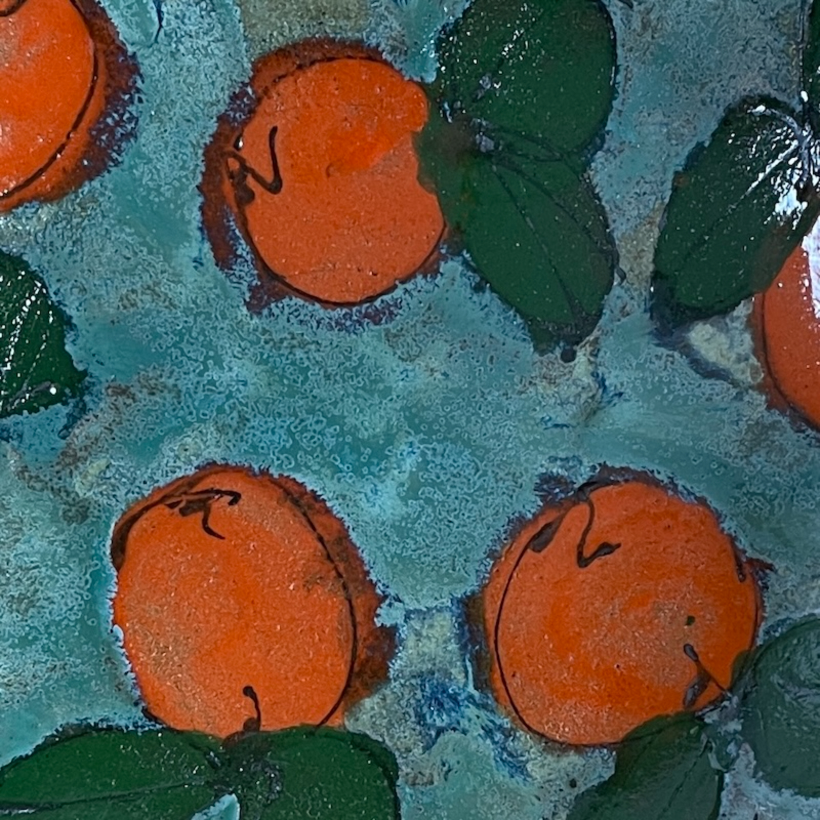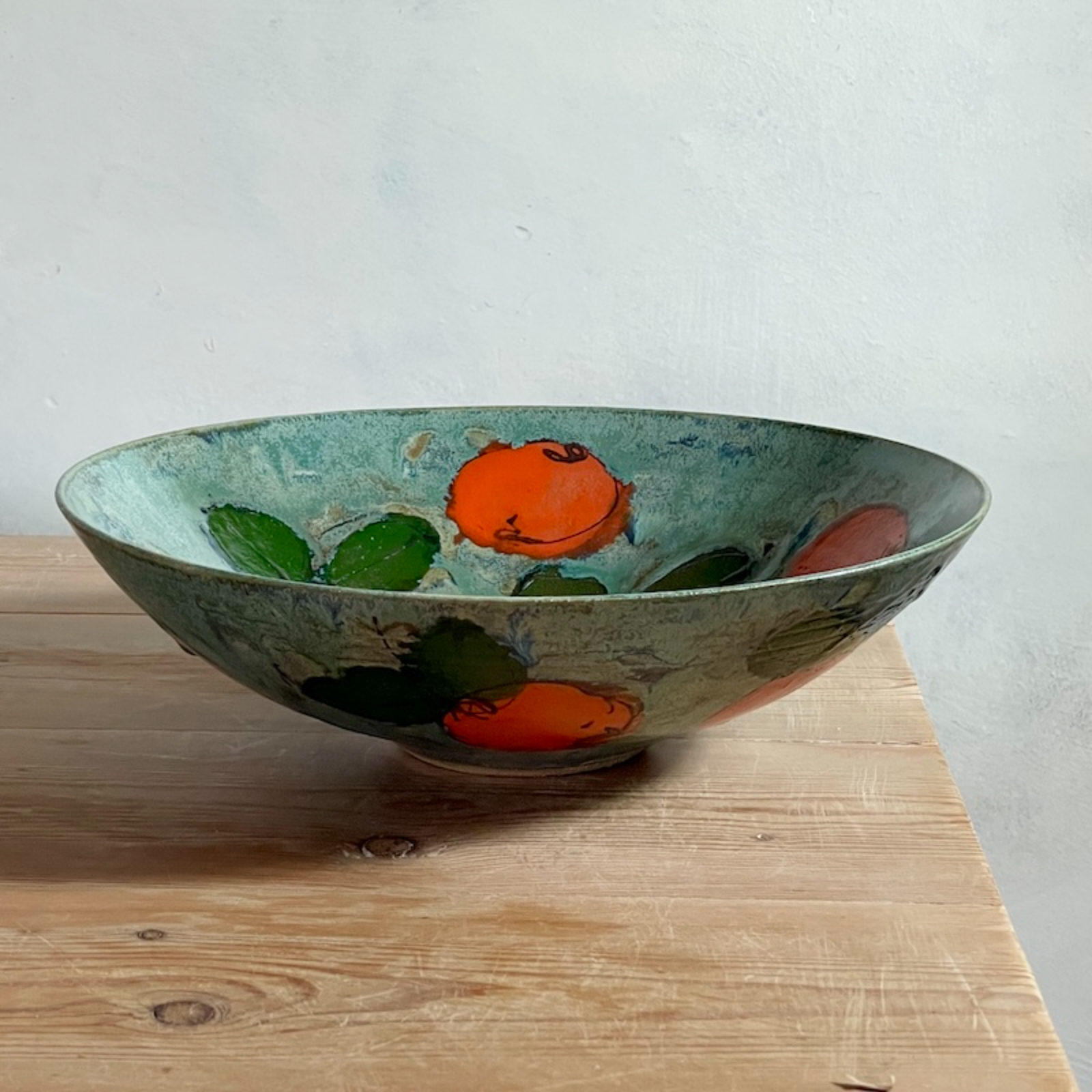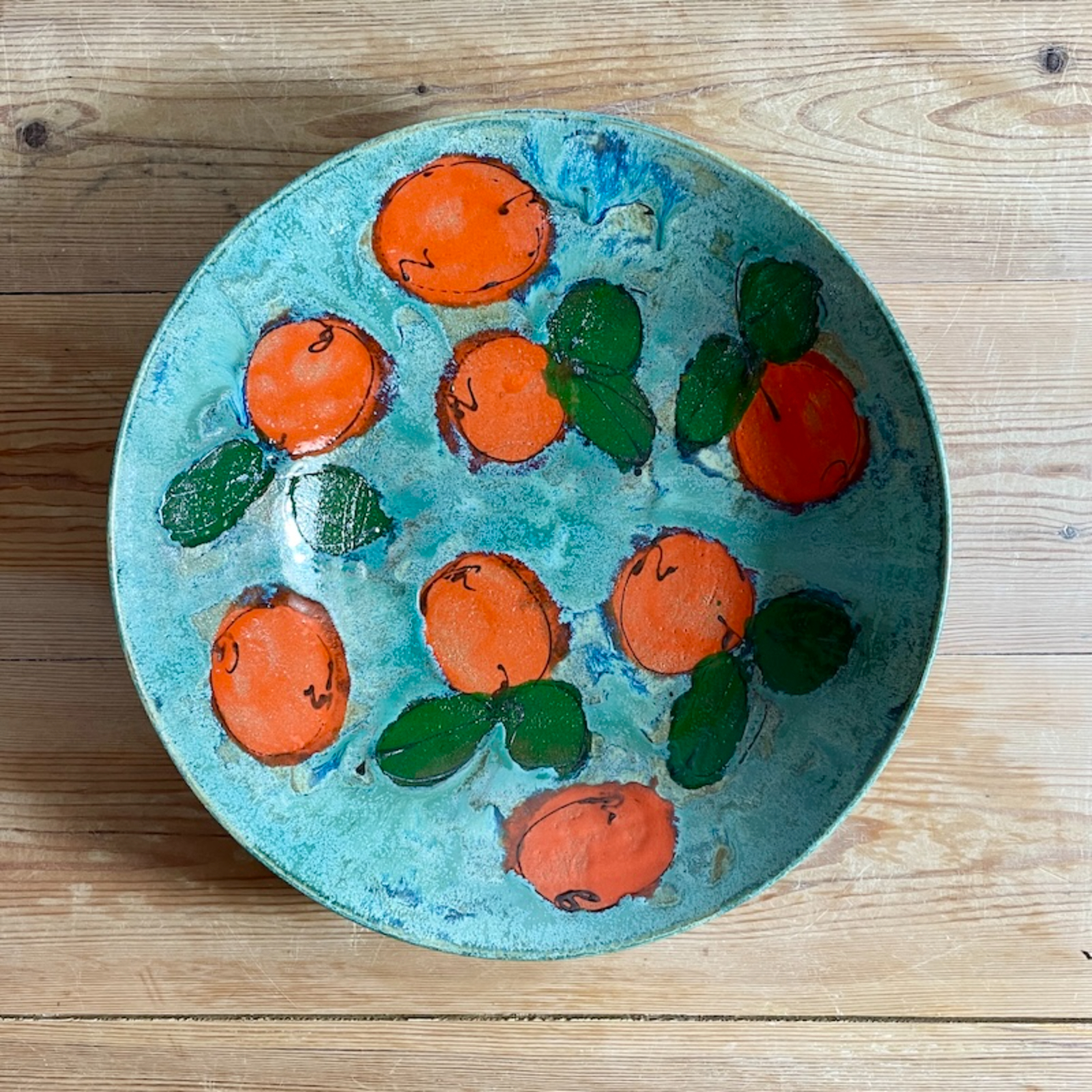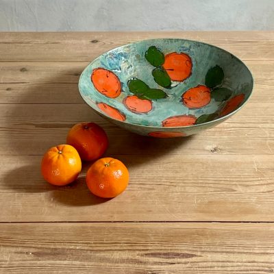 Wheelthrown bowl in a toasty stoneware clay and with rustic teal glaze and hand painted and drawn clementine and leaf motif on the interior and exterior. Great size for salads, fruit and of course clementines.