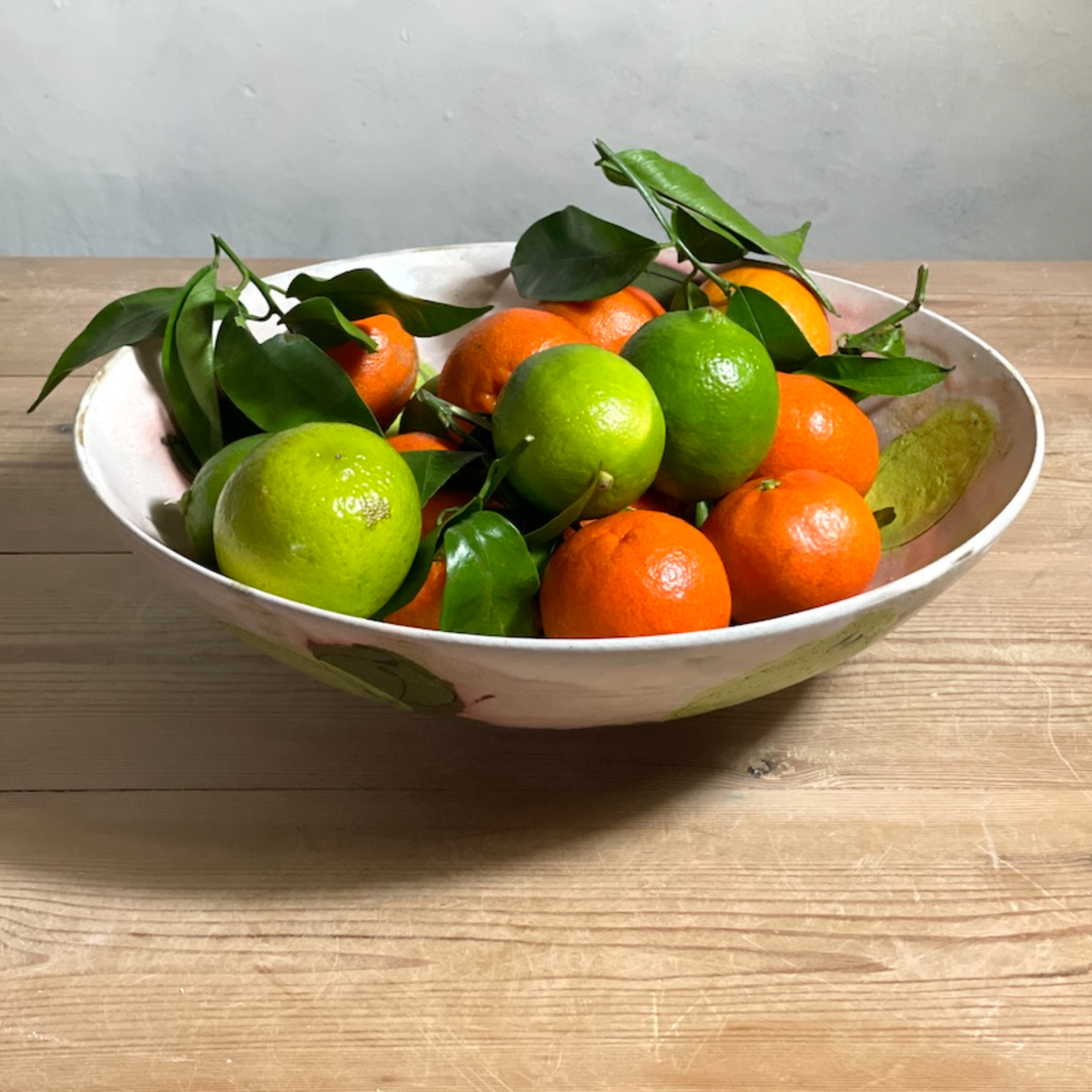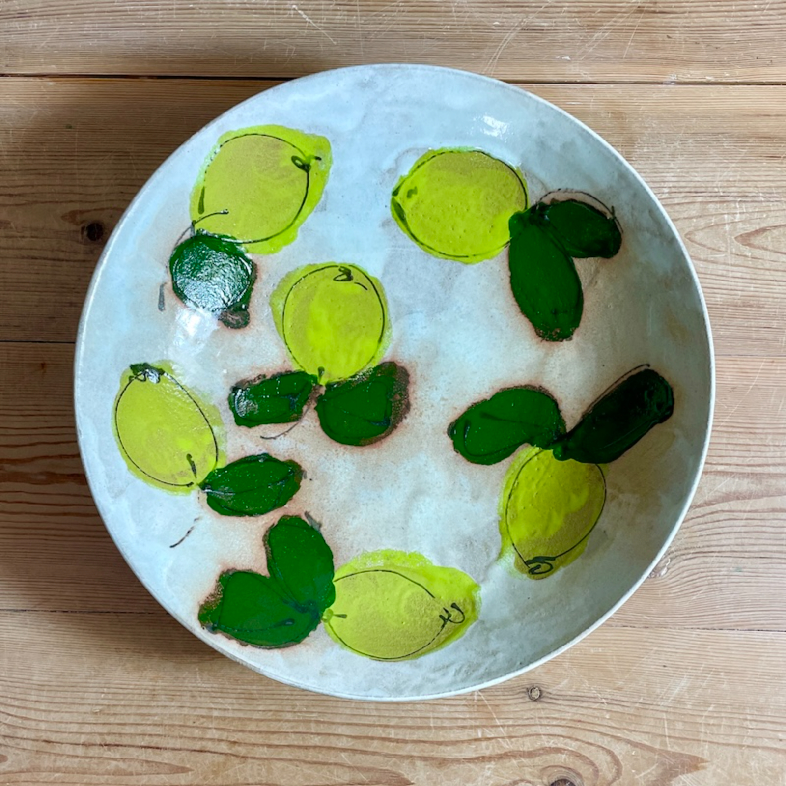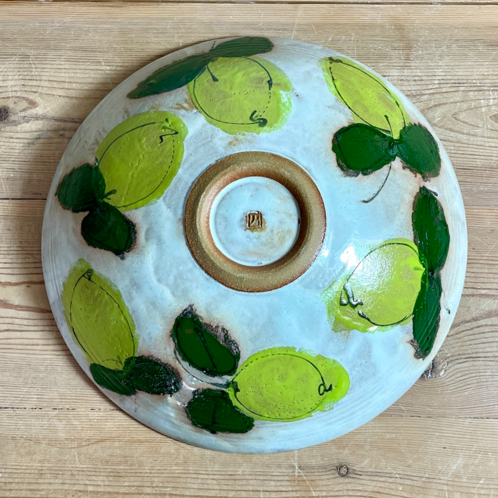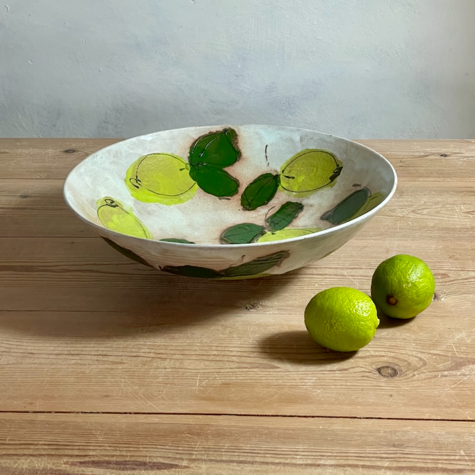 Wheelthrown bowl in a toasty stoneware clay with rustic chun glaze and hand painted and drawn lime and leaf motif on the interior and exterior. Great size for salads, fruit and of course limes.