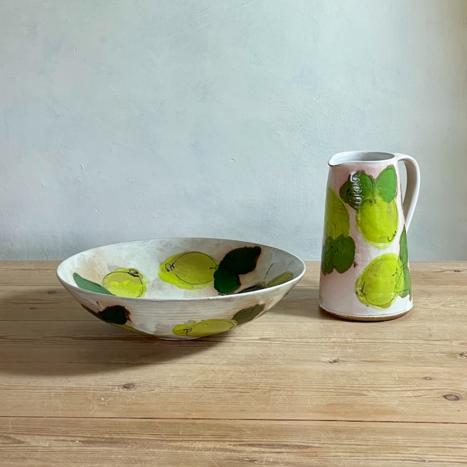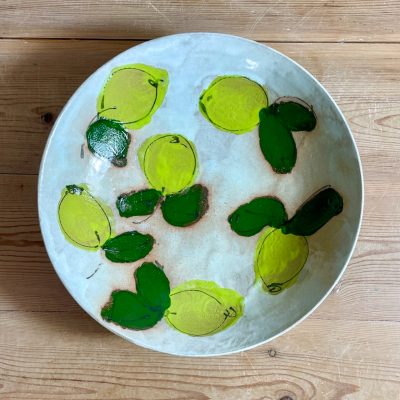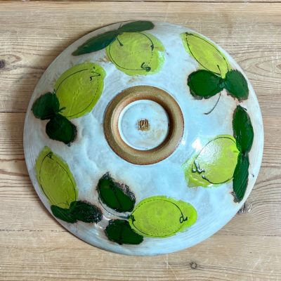 Thrown with nearly two and a half kilos of clay and then trimmed to create a light , thin but practical large bowl. A fun practical and funky addition to any kitchen cupboard. These are fun to throw and even more fun to decorate: -drawing the fine lines of fruit and leaves with a slip trailer and painting on the glazes. I love the freedom of drawing on the pot in this way – and allowing the kiln to do its work – so the fruit stalks and leaves blend with the flowing glaze and create a unique image.