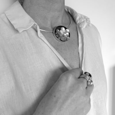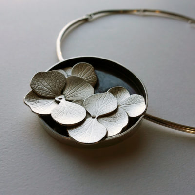 The outer wall of the ‘garden’ is formed by wrapping the silver around a pebble; into this the silver hydrangea blooms are arranged and soldered in place.