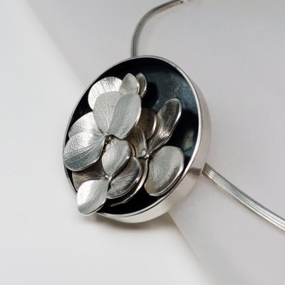 Hydrangea petals look fragile but are amazingly strong. The petals are selected after the flowers have dried out and survived all the weather that autumn and winter can throw at them. These petals imprint into annealed silver in an incredibly detailed way.