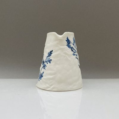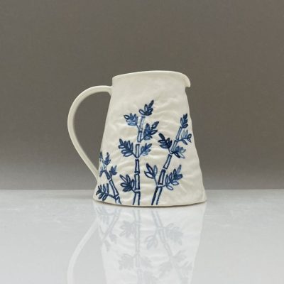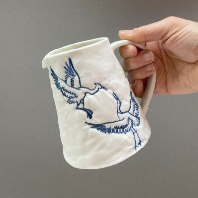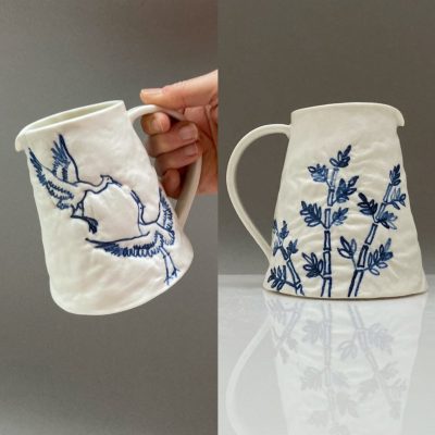 This porcelain jug has a machine embroidered textile texture, depicting a pair of leaping cranes with wings outstretched and on the reverse, swaying bamboo. The texture of the stitches have been overpainted with cobalt before the final firing to give a rich blue finish. The interior and the handle have a transparent, shiny glaze. There are three sprigged buttons on the base to lift the jug slightly off of the table. The jug is 12.5cm tall with an 11cm diameter base.