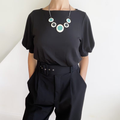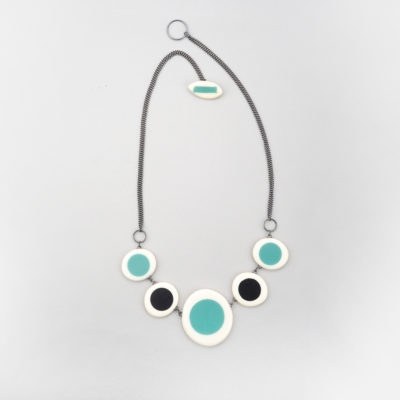 Handmade from resin and oxidised Sterling silver, the long Nabu necklace is a striking statement piece, perfect for colour and design lovers. It can be worn as a complimentary accessory to a smart outfit or a show-stopping piece to go out.