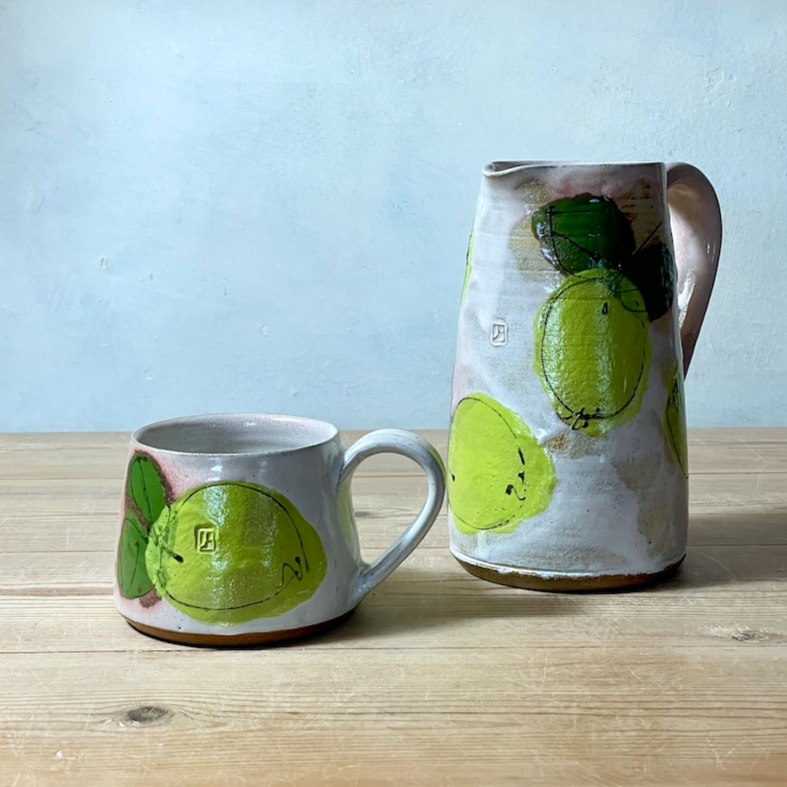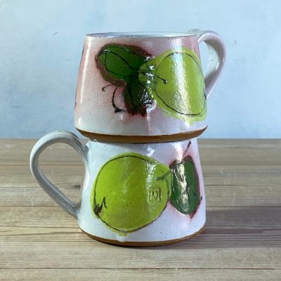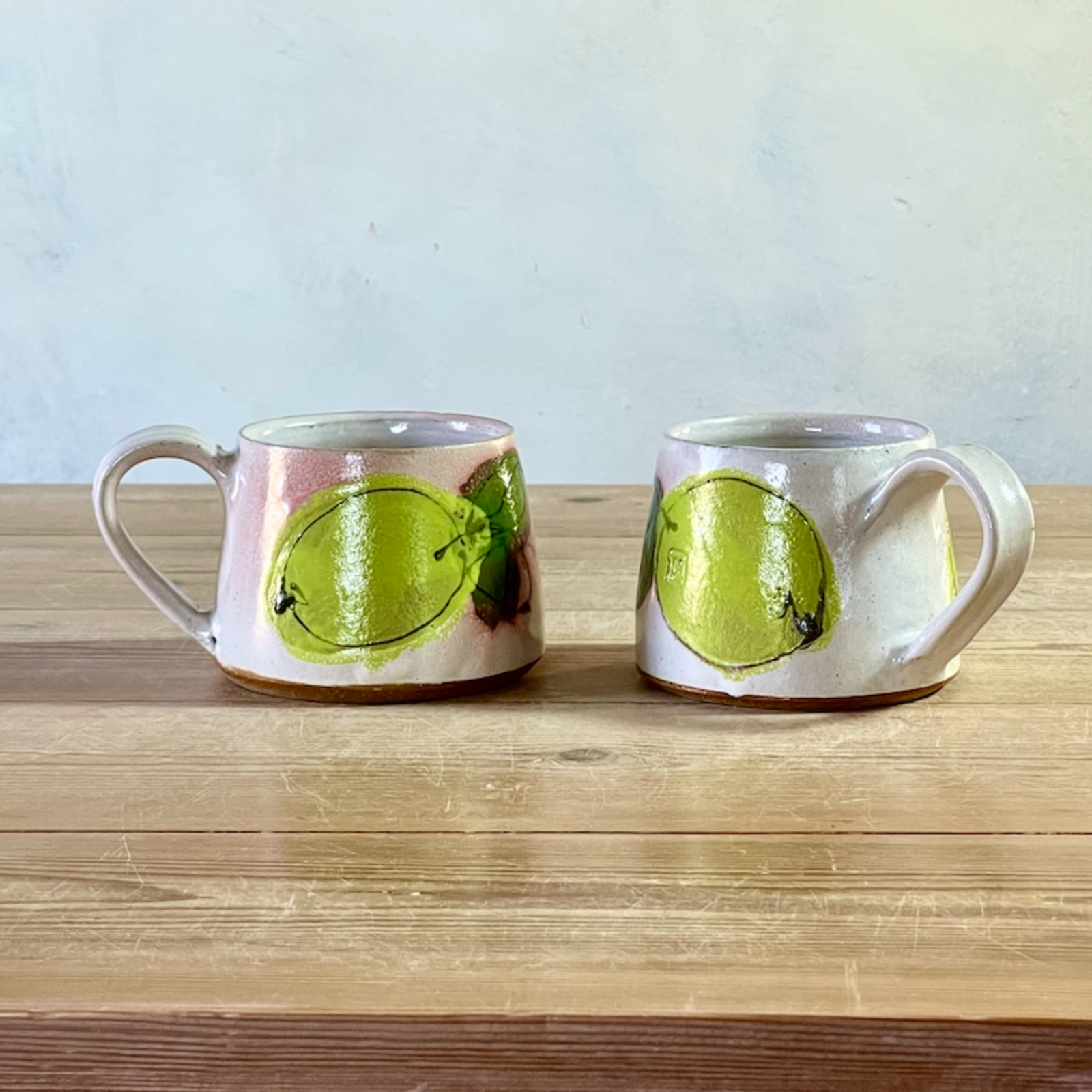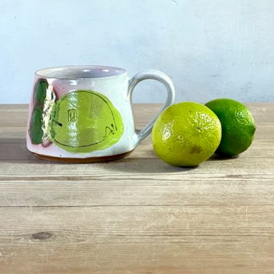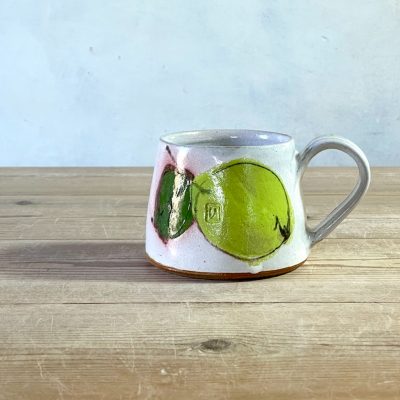Wheelthrown mug in toasty stoneware, with lime and leaf decoration on rustic chun glaze on the exterior – fully plain glazed interior