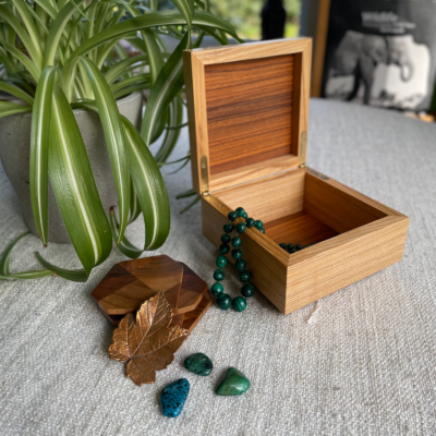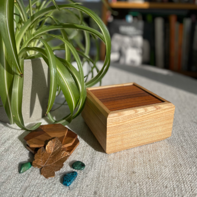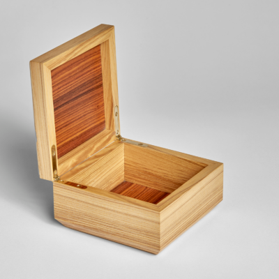 A simple piece, designed to show off the beauty of the timbers. Featuring a recessed leather bottom and a deep chamfer to the sides, the box floats on a subtle shadow gap. The top is recessed to frame the contrasting timber and to provide some tactile interest. Built from striking olive ash and with a pau ferro veneered top and base. This box uses solid brass strap hinges from uk supplier Smartbox maker. These memento boxes can be made in other timbers and sizes if required, contact Philip at Timber Robot for prices and lead times