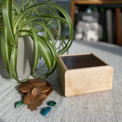 This box uses solid brass strap hinges from uk supplier Smartbox maker. These memento boxes can be made in a variety of other timbers and sizes, contact Philip at Timber Robot for prices and lead times.