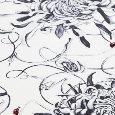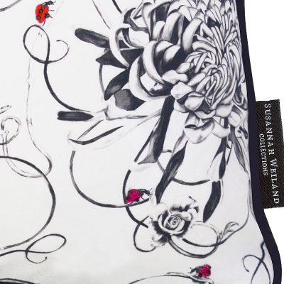 Mini Entangled Chrysanthemums Hand Embroidered and Beaded Cushion by London embroidery artist Susannah Weiland has been hand embroidered and beaded with fine machine embroidery threads and seed beads. Susannah has embellished her pencil drawn illustration with bright highlights of hand embroidery and beading in Richmond upon Thames, and the cushion was sewn together in London. The fabric is cotton heavy sateen on the front with a luxurious black velvet back and piping with a concealed zip. The inner pad is 80% feather and 20% fibre and is made in the UK.