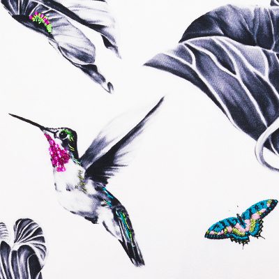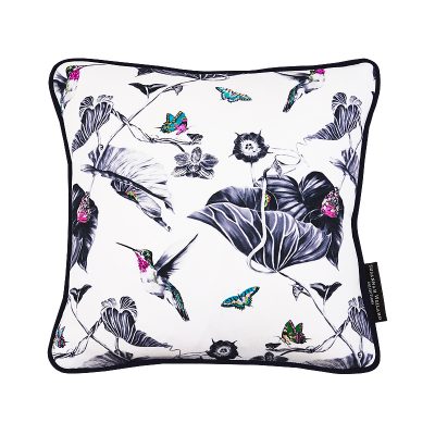 Mini Pink Hummingbirds Hand Embroidered and Beaded Cushion by London embroidery artist Susannah Weiland has been hand embroidered and beaded with fine machine embroidery threads and seed beads. This design is inspired by the tropical plants, orchids and butterflies from Kew Gardens Palm House and the Prince of Wales Conservatory. Susannah has embellished her pencil drawn illustration with bright highlights of hand embroidery and sequins in Richmond upon Thames, and the cushion was sewn together in London. The fabric is cotton heavy sateen on the front with a luxurious black velvet back and piping with a concealed zip. It comes with a duck feather cushion pad. 28x28cm