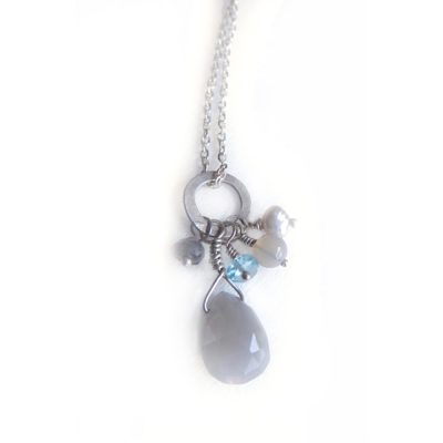 A tear drop grey Moonstone is surrounded by a faceted blue apatite, a grey agate bead, a shimmering grey labradorite and a baroque white cultured freshwater pearl.