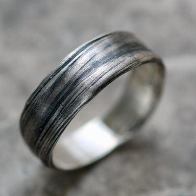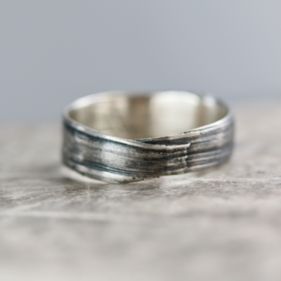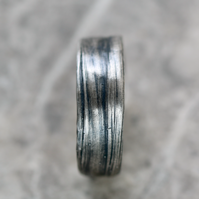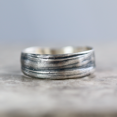A sterling silver, lightly textured band, made initially in Mitsuro Hikime wax, then cast in sterling silver, lightly oxidised to give an aged look.