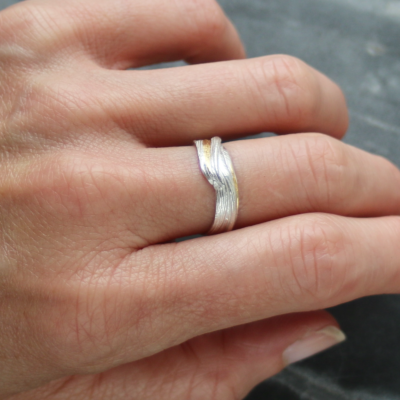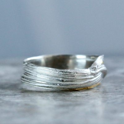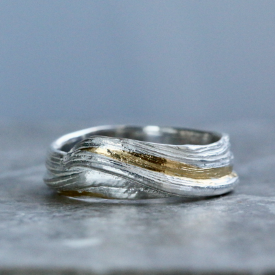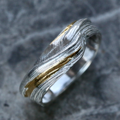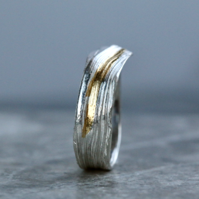 An organic shaped, highly sculptural, textured band, made initially in wax, is then cast in sterling silver before a ribbon of fine gold is bonded permanently on the surface, using the ancient keum boo technique.