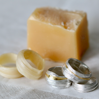 As the Mitsuro Hikime wax is worked, and warms up, it becomes very pliable and stretchy, producing amazing striations and textures. The results can’t be exactly replicated each time as the wax informs the overall result, but the effects are always beautiful. The wax pieces are then cast in the normal lost wax casting process in silver & gold. As the wax is burned away during the process, each piece is completely one of a kind, only cast once.