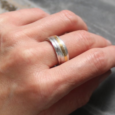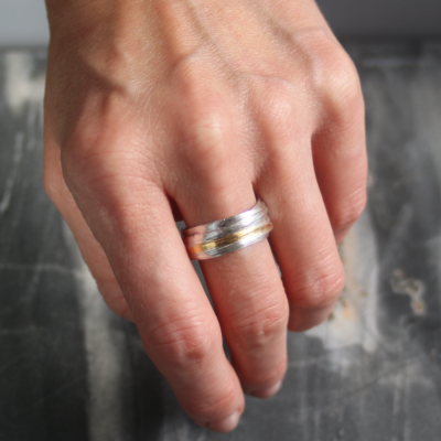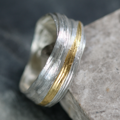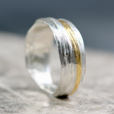 An organic shaped textured band, made initially in wax, is then cast in sterling silver before a ribbon of fine gold is bonded permanently on the surface, using the ancient keum boo technique.