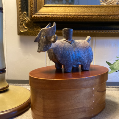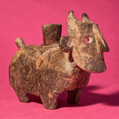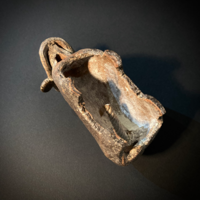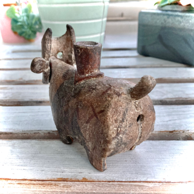 He’s made from a variety of clays mixed together and the resulting variations and imperfections plus an open firing over wood has given patination to the surface.