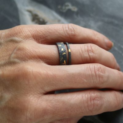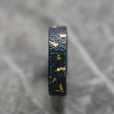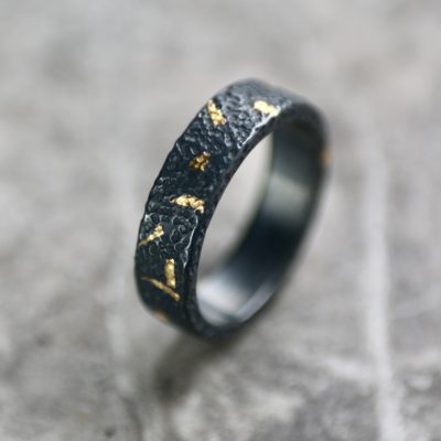 Handmade from solid sterling silver, this flat shaped band is hammered, to give an allover dot texture, with a scattered highlight of pure 24ct gold chips all around the band. The ancient technique of Keum Boo (meaning ‘applied gold’) is used to permanently bond the fine layer of gold to the fine silver surface of the ring, using only heat & pressure, by hand.