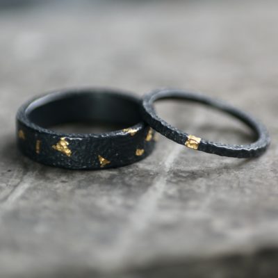 The whole ring is then oxidised to an almost charcoal/ gunmetal grey, to increase the contrast between the 2 precious metals & texture. The dark oxidised surface colouring will eventually wear back to silver, where it gets rubbed, which gives the ring a gorgeous antique look. If you really love the darkness though, it can be re-oxidised back to the darkest tone whenever you like!