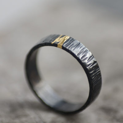 The whole ring is then oxidised to an almost charcoal/ gunmetal grey, to increase the contrast between the 2 precious metals & texture. The dark oxidised surface colouring will eventually wear back to silver, where it gets rubbed, which gives the ring a gorgeous antique look. If you really love the darkness though, it can be re-oxidised back to the darkest tone whenever you like!