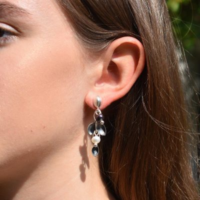 Oyster cluster earrings in silver and oxidised silver with white and peacock blue freshwater pearls. The hanging earrings are extremely light and elegant to wear. A matching Oyster Cluster Necklace is also available.