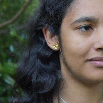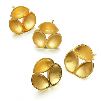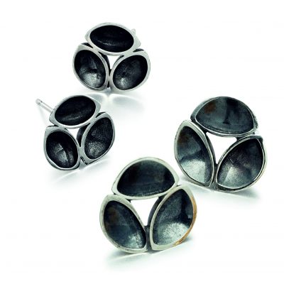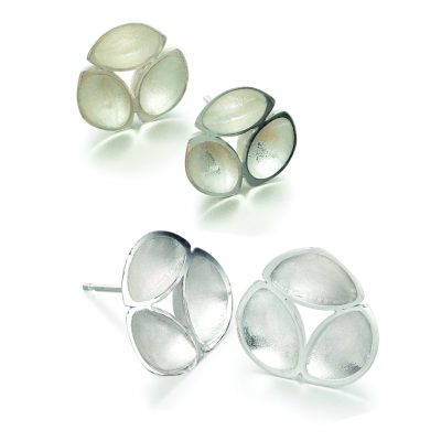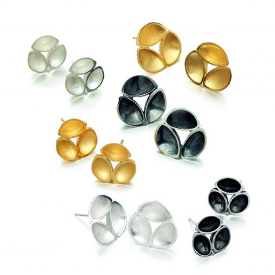 Sterling silver stud earrings available in white silver, black oxidized silver and 18ct gold plate. Light and easy to wear. available in a large or small size. Clip on earrings with the larger stud size can be ordered by contacting Annie directly. Model shot shows smaller size.