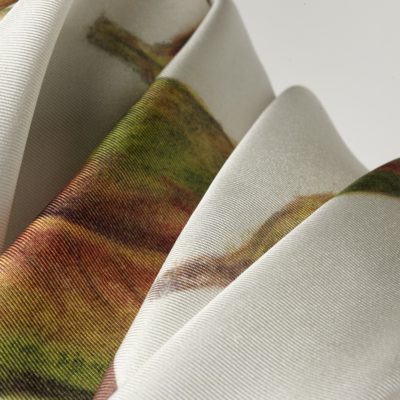 Using state of the art eco friendly textile printing methods the artwork was then printed onto a luxurious silk twill.