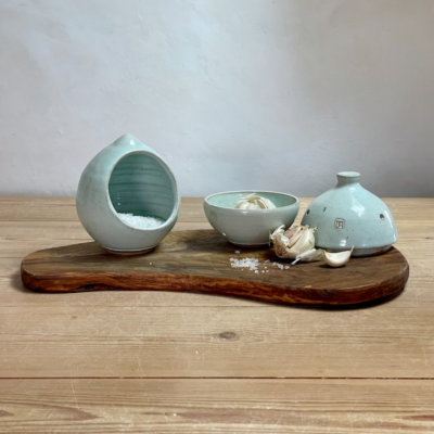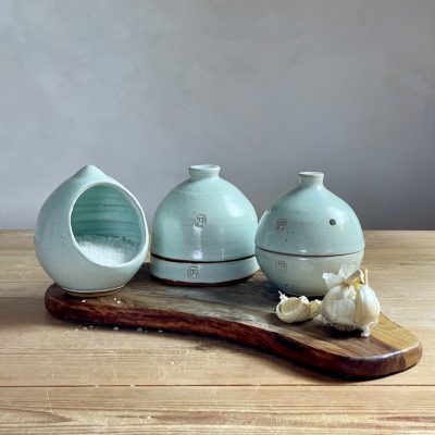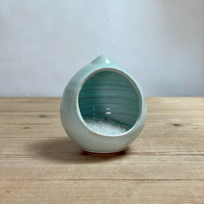 I finally settled on this design after trying a few out, it’s simple and practical and a great addition to a busy cook’s kitchen. The salt pig is thrown as a sphere – closing the form at the top, allowing it to dry before creating a foot on the base and creating the opening – the throwing rings on the inside show how it is made, and the glaze breaks gently over the undulating surface.