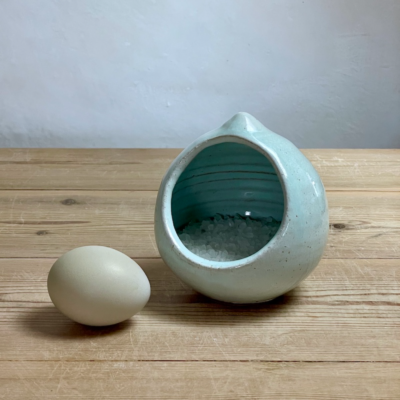 Wheelthrown salt pig in a toasty stoneware clay and finished in duck egg blue silky glaze – so great for rock salt or flakes – easy access for cooking. Can be ordered in different finishes.