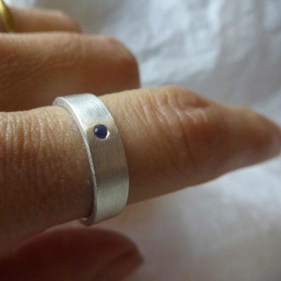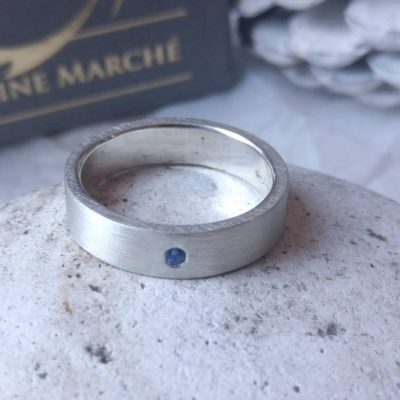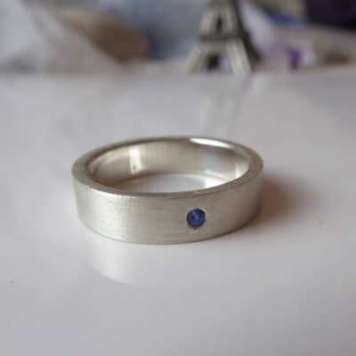 A wedding ring handmade in recycled sterling silver, suitable for men and women, set with a blue sapphire, to symbolise the sparkles of love.