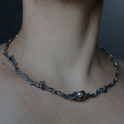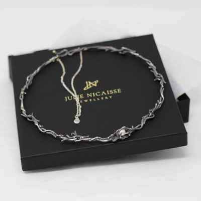 The powerful and voluptuous shapes of the Ocean choker necklace will transport you to the peaceful world of the abyss. Embracing a large lustrous white pearl, this exquisite statement necklace is inspired by the beauty and magic inhabiting the ocean. Handcrafted in 925-sterling silver left in its raw form, adorned with subtle 9 carat recycled yellow gold beads the Ocean necklace is fitted with a delicate backdrop chain for an added touch of elegance.