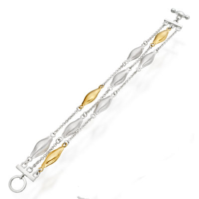 Triple strand silver and 18ct gold plate bracelet available in two lengths 18cm and 20,5cm, best worn slightly fitted.