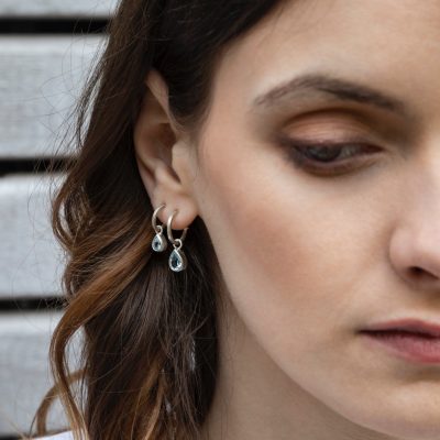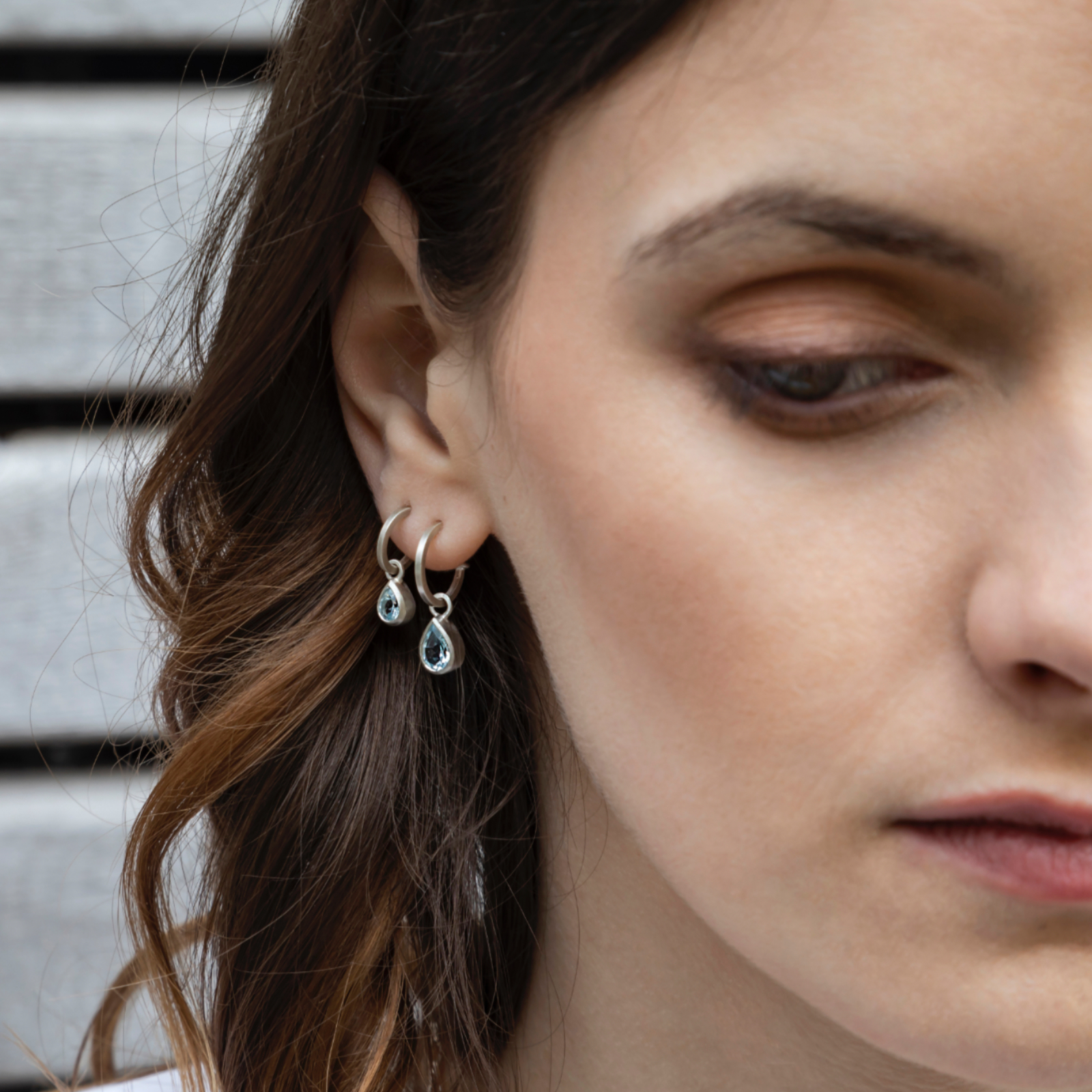 Delicate little silver hoops with a hand set semi precious drop stone! So easy to wear, daytime or evening and a perfect pairing with the new random drop necklaces. Available with a number of different stones (7mm x 5mm stone).