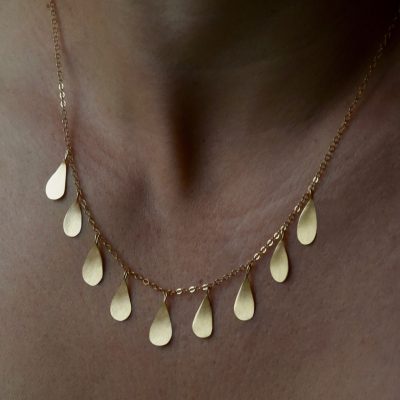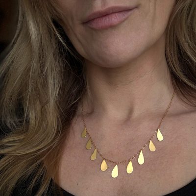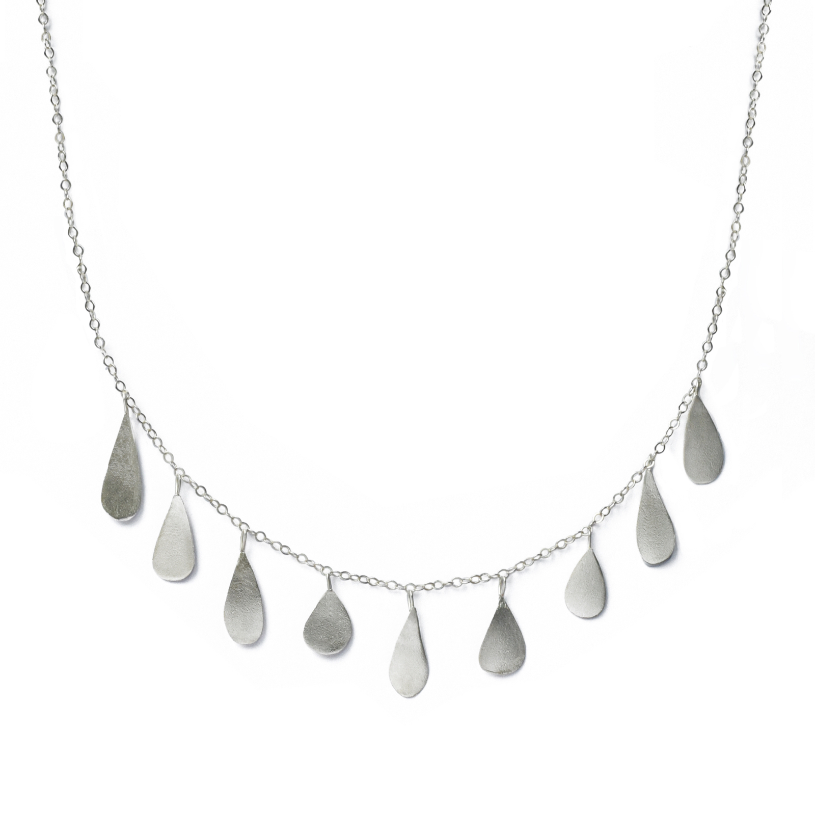A spray of shimmering burnished drops, each hand cut and finished. The satin finish on the drops catch the light beautifully. A versatile, timeless necklace that works for both formal and casual wear.