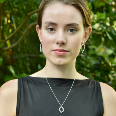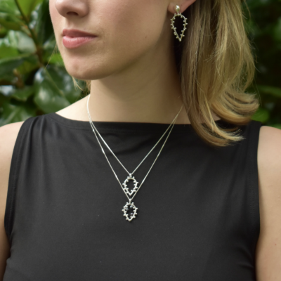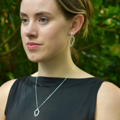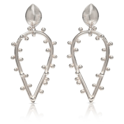 These teardrop earrings are inspired by the textures and shapes found on sea urchin shells. Once the teardrop shape is constructed the silver balls are individually soldered on so that each pair is unique.
