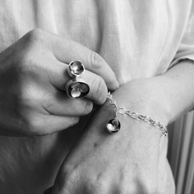 The outer wall of the ‘garden’ is formed by wrapping the silver around a pebble; into this the silver hydrangea bloom is placed.