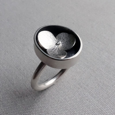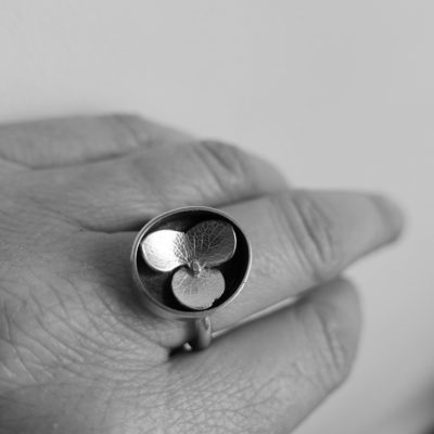 This ring features a single hydrangea bloom. Each flower is hand fabricated using silver imprinted with dried hydrangea flowers to create a unique tiny arrangement, consequently no two rings will be exactly the same. Please contact us with your ring size when ordering.