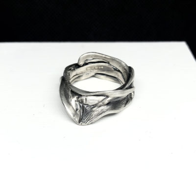 A sculptural and sinewy 100% recycled Sterling silver ring that wraps around your finger like a second skin. Featuring a subtle patina to accentuate the imprint of my skin on the surface of the piece.