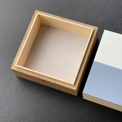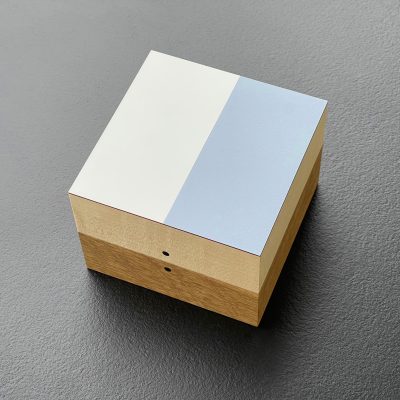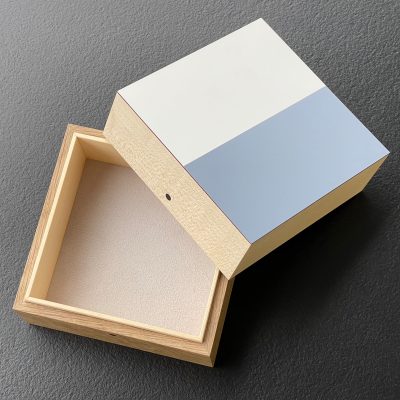 I’ve always been into squares, and I like the simplicity of two equal parts. In essence, that’s what this box is all about. Physically, it’s divided horizontally into two equal sections and on the top, it’s divided graphically into two equal parts, white and light blue.