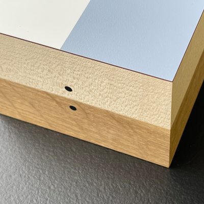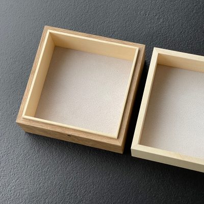 Divided horizontally into two equal parts, the top half of this box is Sycamore and the bottom half is Oak. Two equal sections of plastic laminate are bonded to the top of the box in a 50-50 arrangement. The inside walls of the bottom half are lined with Sycamore and the base and top are lined with light grey suede.