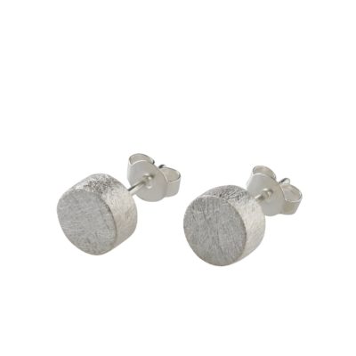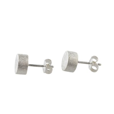 These are small textured silver cylinder-shaped earstuds. They are hollow and closed at the back with a 0.9mm post.