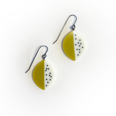 These lime green and white resin drop earrings are cast in a leaf-shaped design, and ornate with black polka dots.