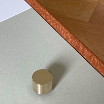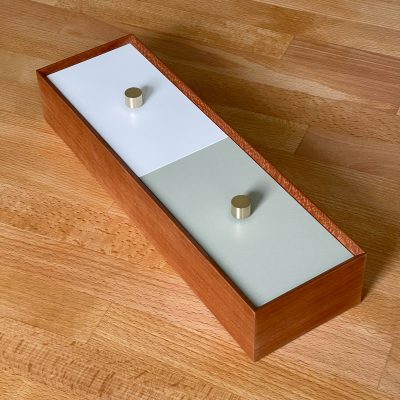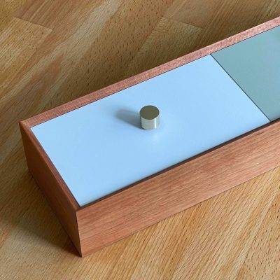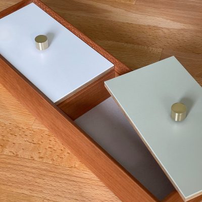 The two lids separately feature ‘Fossil’ and ‘White’ ColorCore (solid core laminate) by Formica and the handles are machined from solid brass.