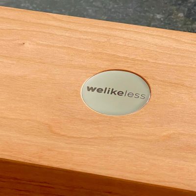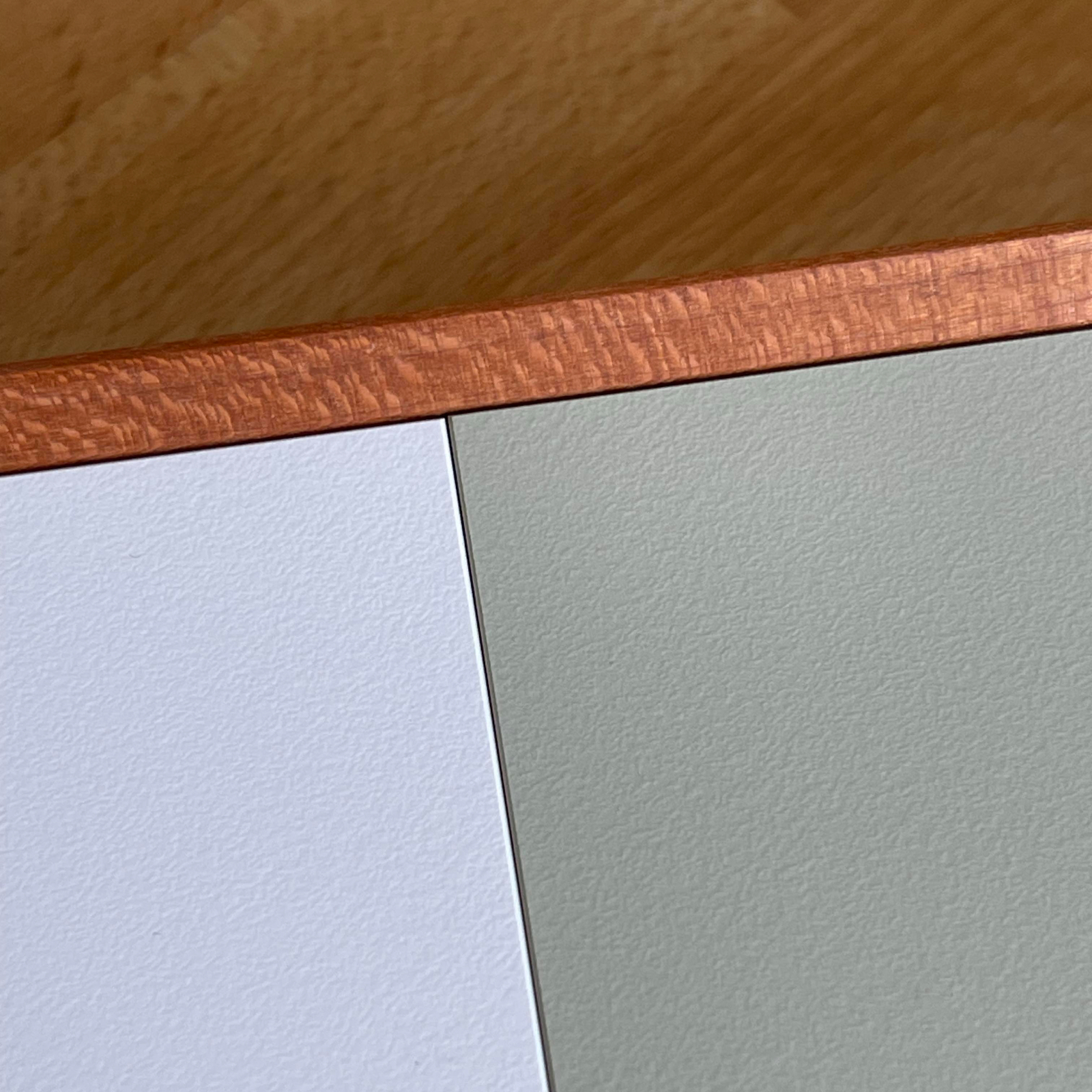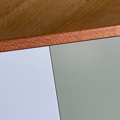 I am always interested in the contrasts to be enjoyed between natural materials with their inherent inconsistencies and man made materials characterised by flawless consistency. Solid core (plastic) laminate delivers flawless flat colour. The gentle texture of the laminate provides a matt finish that delivers a further degree of flatness. The two snowy colours contrast with the warmth of the cherry wood.