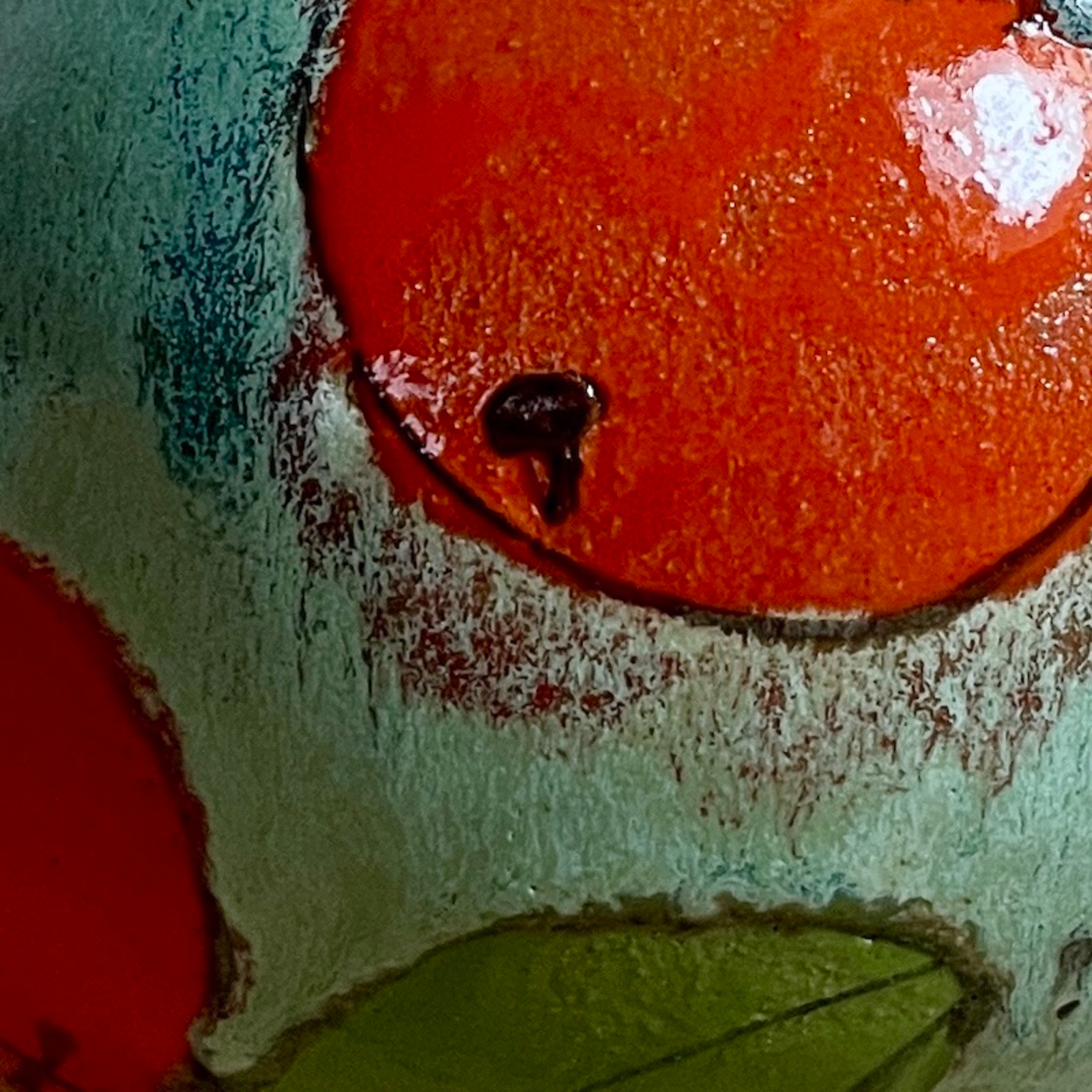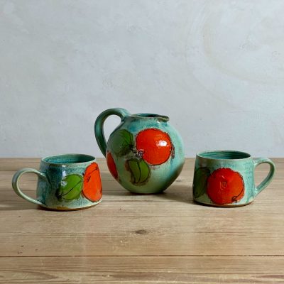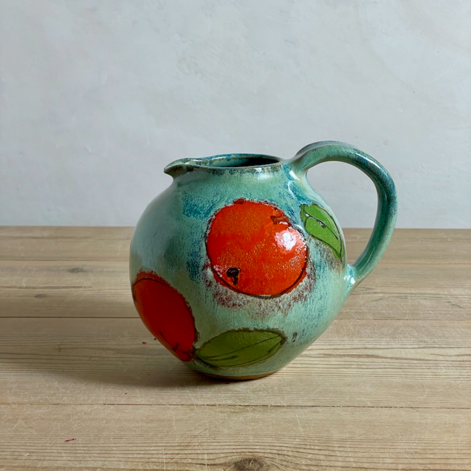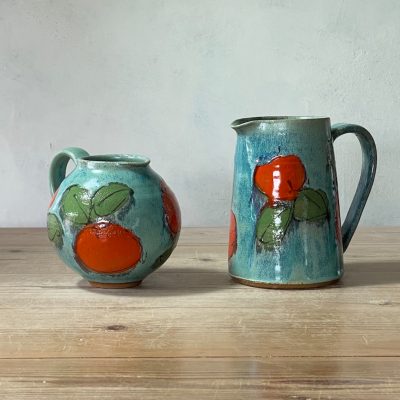 This vibrant little jug just makes me smile and brings a splash of colour to any table or dresser. These fruity pieces are fun to make – drawing the fine lines of fruit and leaves with a slip trailer and painting on the glazes. I love the freedom of drawing on the pot in this way – and allowing the kiln to do its work – so the fruit stalks and leaves blend with the flowing glaze and create a unique image – no two will be the same.