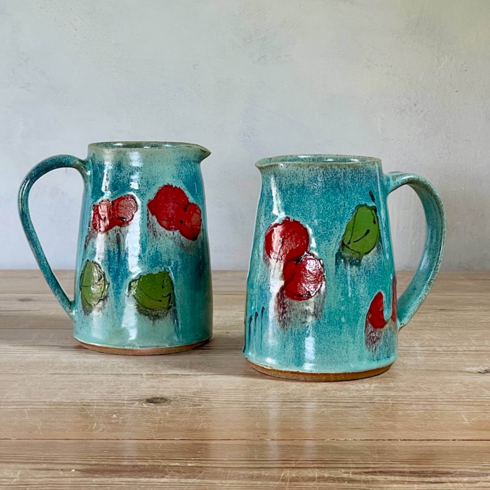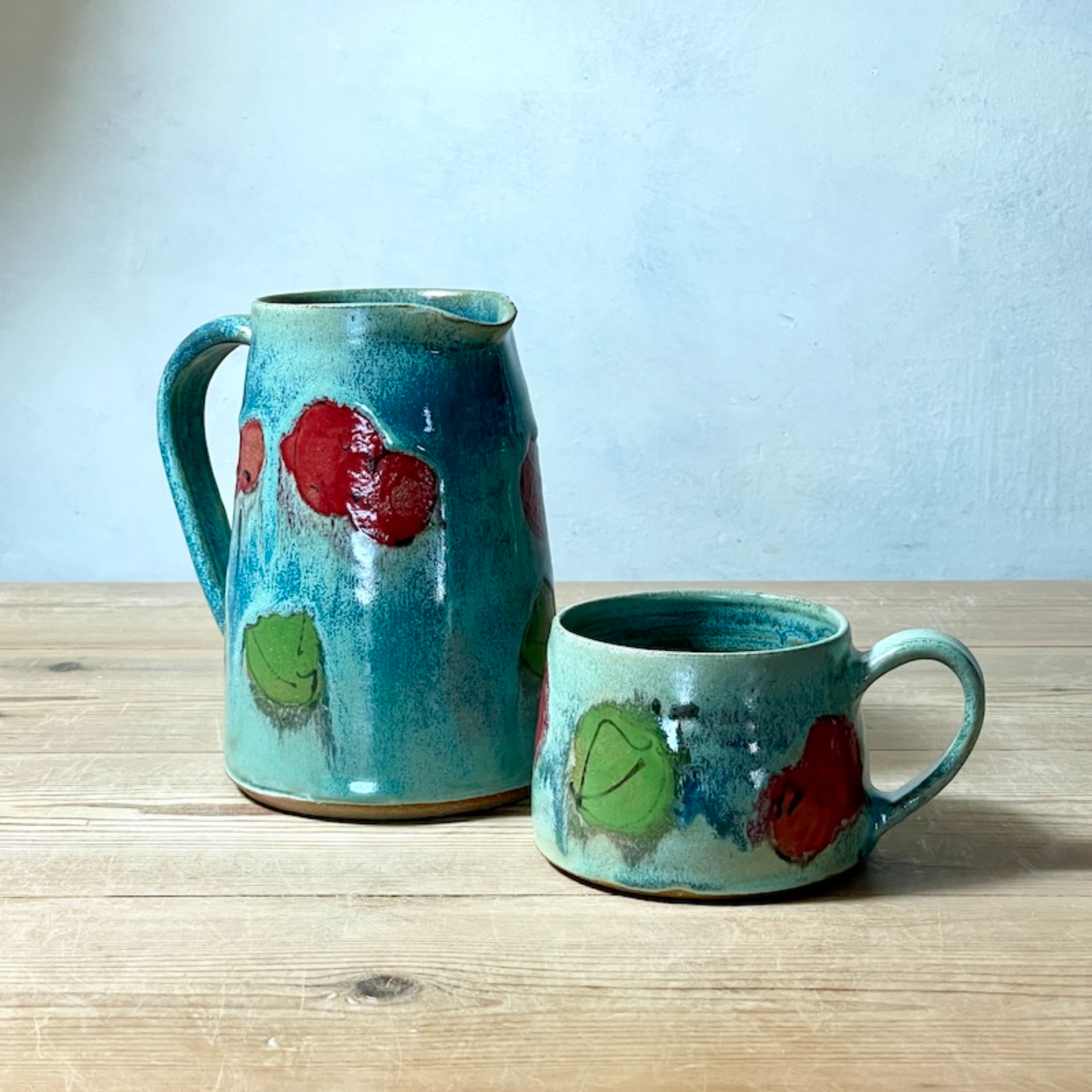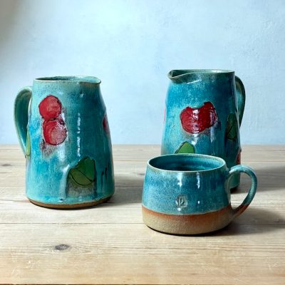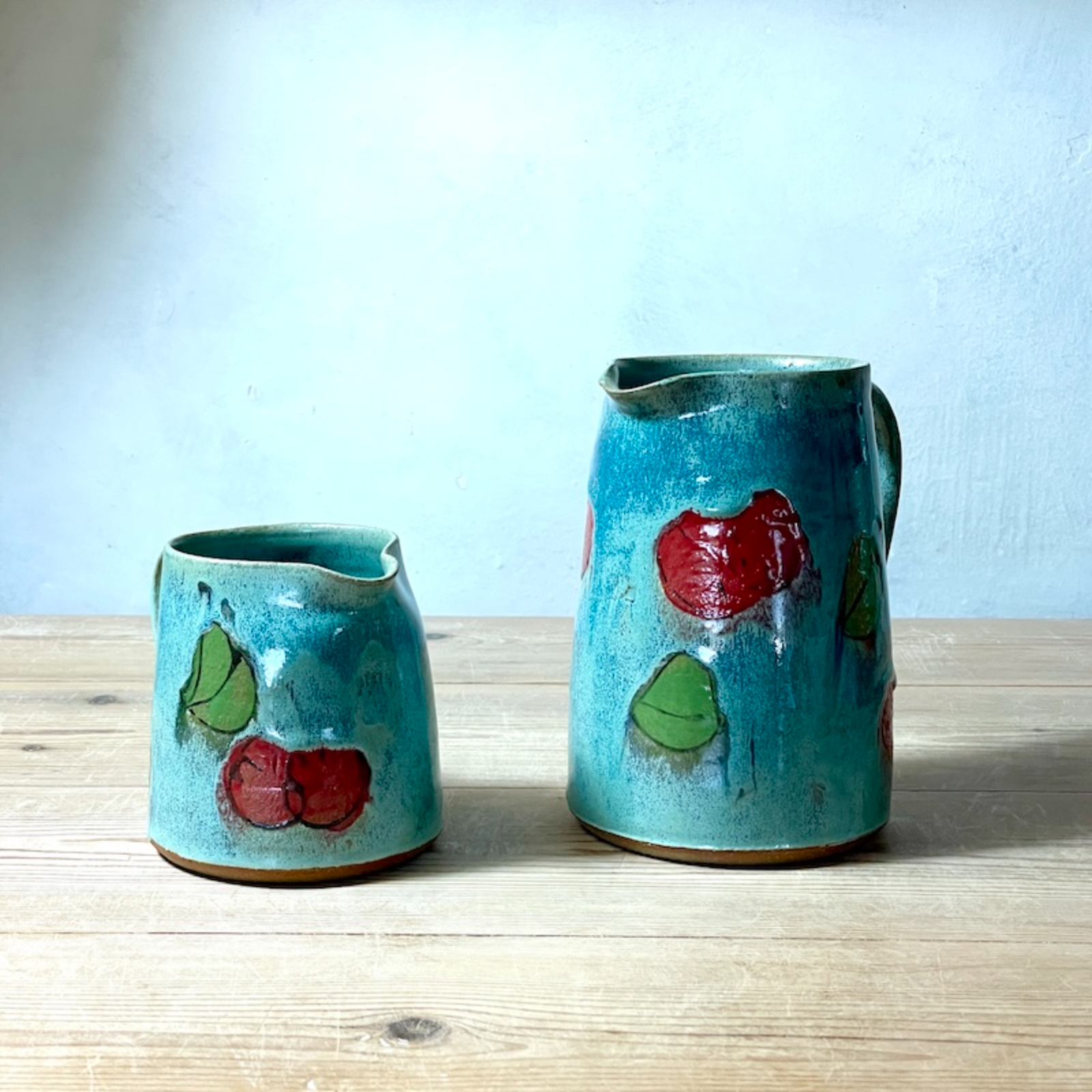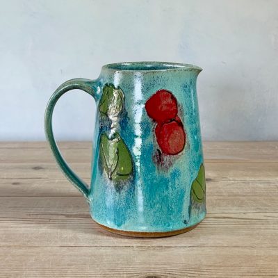 Wheelthrown straight sided medium sized jug tapering to the rim in a toasty stoneware clay and with vibrant eau de nil glaze and hand painted and drawn cherry and leaf motif on the exterior. Plain eau de nil on the interior . Great size for milk, cream, custard, gravy, mayo, sauces and jus!
