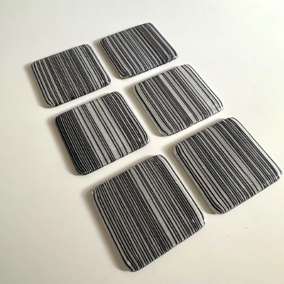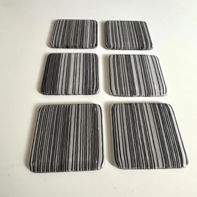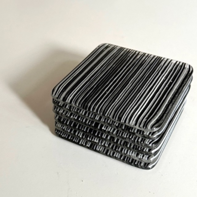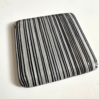 This stylish contemporary coaster set is stunning. The combination of black, white and grey stripes work beautifully together. They are handmade from ‘Bullseye’ glass sheets and 1 mm stringers (rods), then kiln-formed.