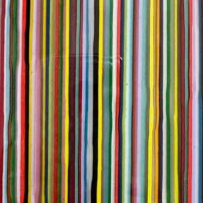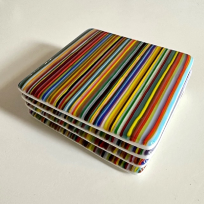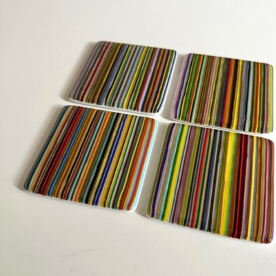 They are created with ‘Bullseye’ glass sheets and 1mm stringers (rods), then fused in the kiln. The white base glass illuminates the coloured stripes above.