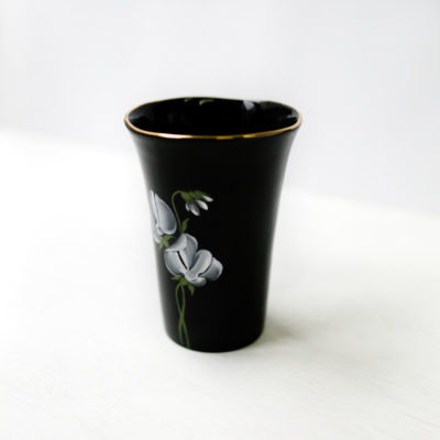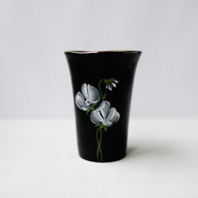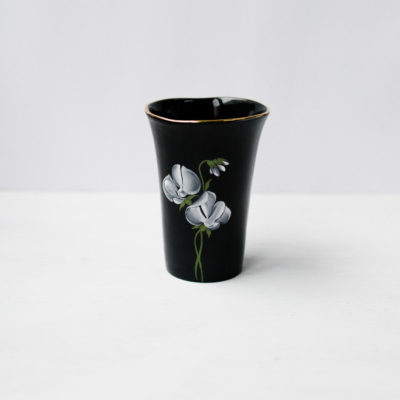 Slip casted Black Porcelain beaker with hand painted Sweet Peas motive.Perfect for morning tea, to brighten up your day. Has the beautiful, deep darkness of black and smooth, silky feel to the glaze on it. Each piece is 3 times fired. First the raw piece, than glaze applied and fired again. Final stage is the hand painting, where the porcelain colour painted in 3 layers on top of each other’s; base, outlines, and shadows. Gold lustre applied than to the rim, and fired again, where the porcelain colour sinks into the glaze, takes a shiny, glaze-like quality, and makes it permanent.